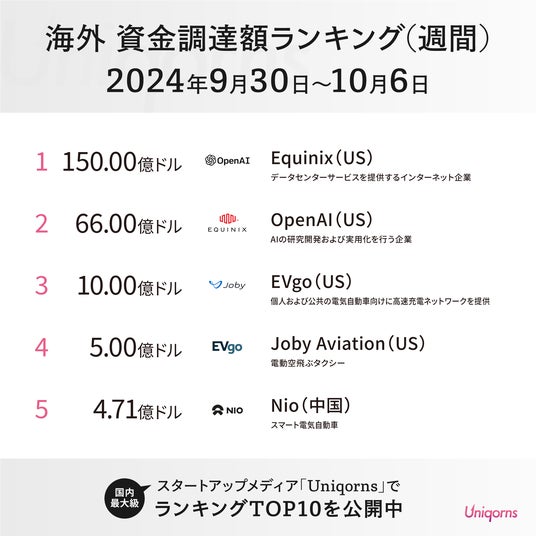 国内最大級のスタートアップメディア「Uniqorns(ユニコーンズ)」(運営:株式会社エモリューションクリエイティブ 本社:福岡市、代表取締役:松石 圭介)が発表した2024年9月30日~10月6日の海外スタートアップ資金調達ランキングで、AIの研究開発企業OpenAIと電動空飛ぶタクシーを開発するJoby Aviationが大型調達を実施し、注目を集めています。ChatGPTで知られるOpenAIは66億ドルの資金を調達し、Microsoft、Nvidia、SoftBankなど世界的な企業から投資を受けて2位にランクイン。一方、Joby Aviationはトヨタから5億ドルを調達し、4位に入りました。首位には150億ドルを調達したデータセンター企業Equinixが輝き、AI、モビリティ、インフラなど幅広い分野で革新的な技術を持つスタートアップへの大規模投資が続いていることが浮き彫りになりました。