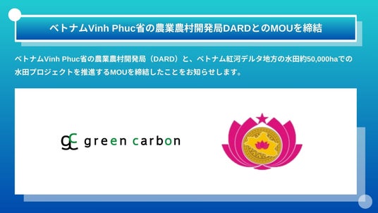 Green Carbon株式会社(代表取締役:大北潤、以下Green Carbon(読み:グリーンカーボン))はこの度、 ベトナム*¹Vinh Phuc省の農業農村開発局(以下DARD)と、ベトナム紅河デルタ地方の水田約50,000haでの水田プロジェクトを推進するMOUを締結したことをお知らせします。