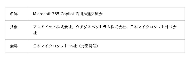 アンドドット株式会社(本社:東京都渋谷区、代表取締役:茨木 雄太、以下:アンドドット)は、ウチダスペクトラム株式会社(本社:東京都中央区、代表取締役:實本 雅一)、日本マイクロソフト株式会社(以下:日本マイクロソフト)の協力のもと、Microsoft 365 Copilot(以下:Copilot)の社内活用推進を担う担当者を対象とした交流会を開催しました。