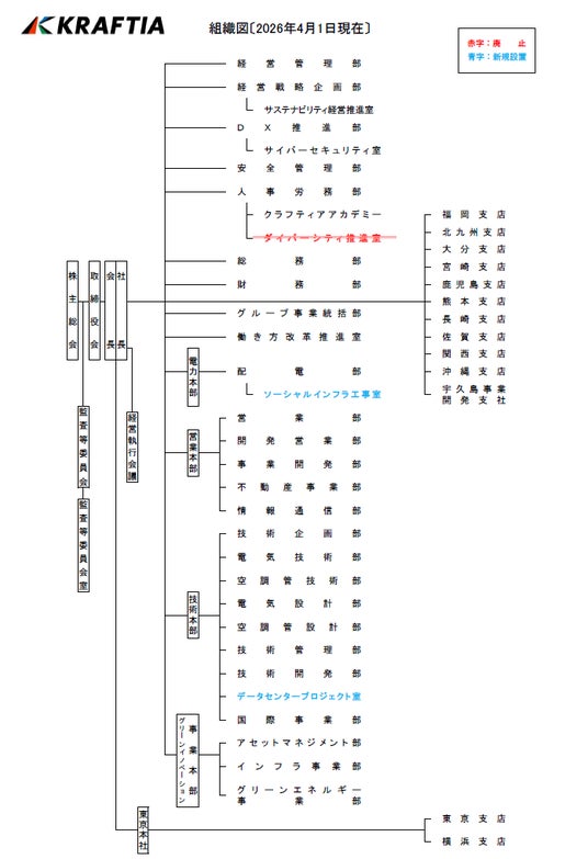 弊社は2026年4月1日付で、「ソーシャルインフラ工事室」及び「データセンタープロジェクト室」を新設し、「ダイバーシティ推進室」を廃止することを決定致しましたので、以下の通りお知らせします。