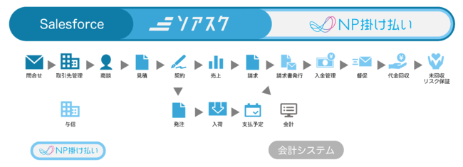 今回のサービス連携により、BtoBサブスクリプション事業社は商談情報を、契約の管理から見積、請求業務、入金管理までをSalesforceプラットフォーム上で実現することが可能になります。 請求情報がソアスクからNP掛け払いに連携され、請求書がNP掛け払いにて自動的に発行されます。入金管理/督促まで対応しており、請求業務そのものをアウトソーシングすることができ、効率的な業務遂行が実現されます。