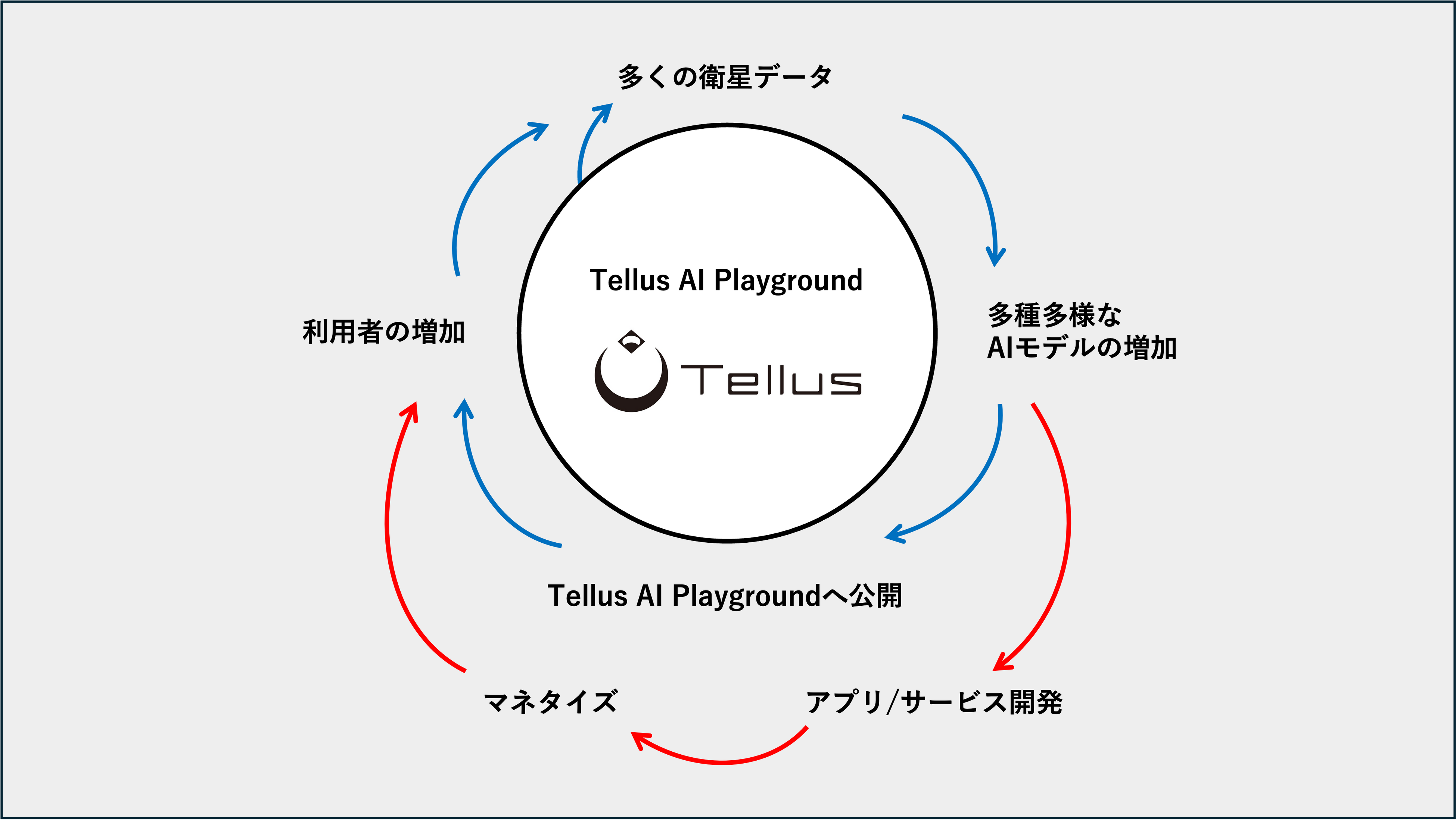 多種多様な基盤モデルを「Tellus AI Playground」に公開することで、さまざまな産業からの新規参入を促し、衛星データ市場の拡大に資するアプリケーション・サービスの創出を加速します。あわせて、Tellusを通じて衛星データやGPUなどのシームレスな解析環境を提供することで、新たな基盤モデルが継続的に生まれる循環型エコシステムの構築を目指します。