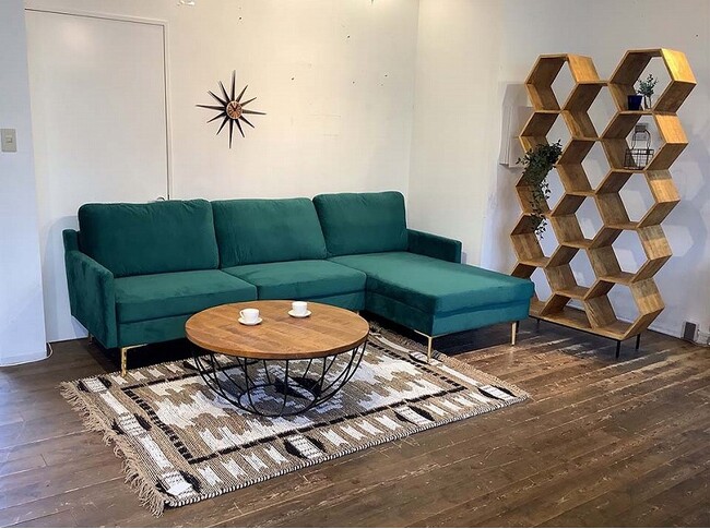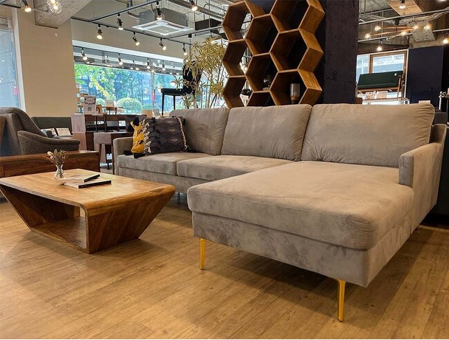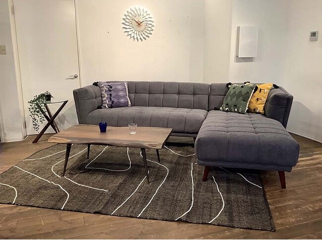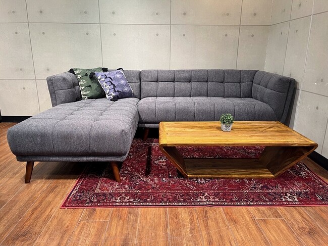 シックなグレーの色合いが落ち着いた印象で、どんなお部屋にも合わせることができます。ステッチやボタンなどデザインが凝っており、シンプルなおしゃれさがあります。角が丸く、すっきりとした背もたれとアームで圧迫感を感じさせないデザインです。カウチが向かって左側につくLタイプと、右側につくRタイプがあります。