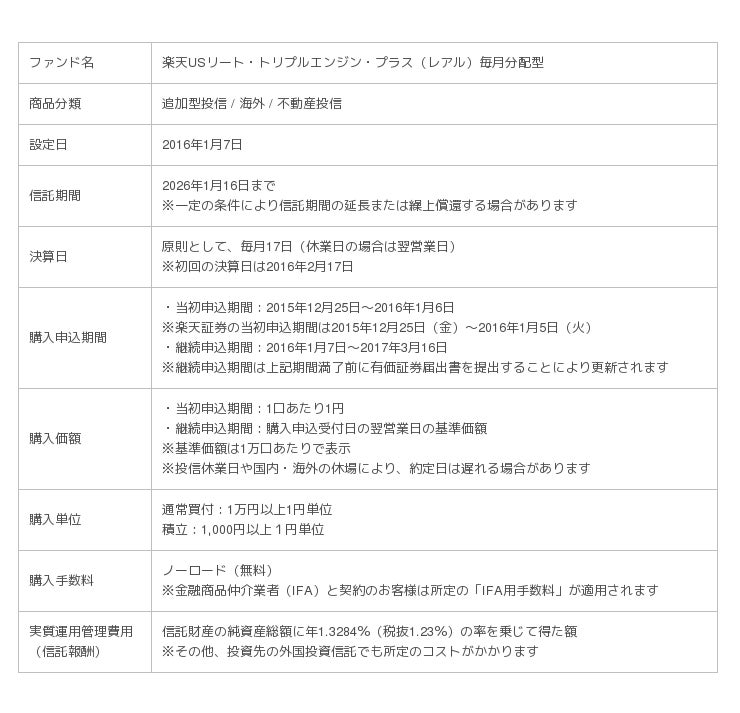楽天証券株式会社(代表取締役社長:楠 雄治、本社:東京都世田谷区、以下「楽天証券」)は、楽天投信投資顧問株式会社(代表取締役社長:色川 徹、本社:東京都世田谷区、以下「楽天投信投資顧問」)が新規に設定・募集する投資信託「楽天USリート・トリプルエンジン・プラス(レアル)毎月分配型」を、2015年12月25日(金)から取扱いを開始します。