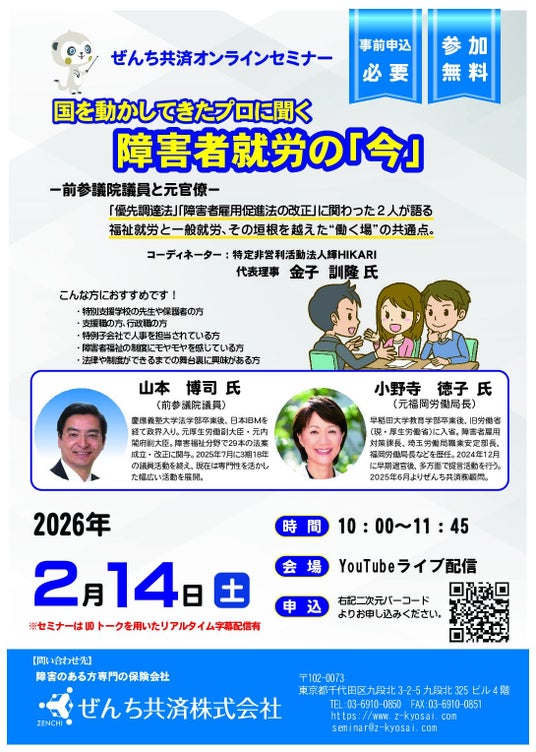 障害者向けの保険を取り扱う専門保険会社、ぜんち共済株式会社(本社:東京都千代田区、代表取締役社長:榎本重秋)は、2026年2月14日(土)に、前参議院議員と元官僚という、政策・行政の最前線を歩んできた二人の専門家から、最新の福祉動向を学べるオンラインセミナーを開催いたします。