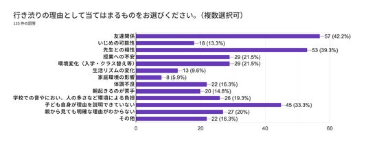 また、子どもの行き渋りを経験したことがある親に対し、行き渋りの理由を聞くと、最多は「友達関係」(42.2%)、次いで「先生との相性」(39.3%)、「子ども自身が理由を説明できていない」(33.3%)でした。