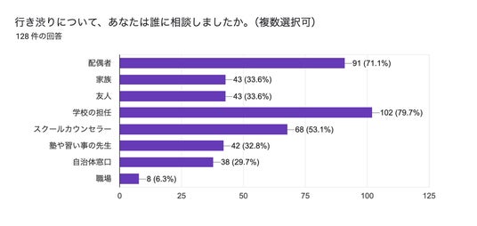 相談相手は「学校の担任」(79.7%)が最多で、次いで「配偶者」(71.1%)、「スクールカウンセラー」(53.1%)でした。