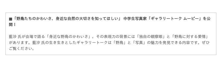 若手写真家応援プロジェクト第21弾は、東京都内で生きる野鳥の姿をとらえた中学生写真家・藍沙氏の写真展を開催いたします。