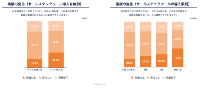 セールステックツール導入群の方が業績が好調で、3つ以上のツール導入をしていると回答した群で特に業績好調な傾向が顕著。