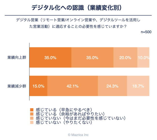 業績が不調な企業に属する人の方が、デジタル営業に適応する必要性を感じていない。