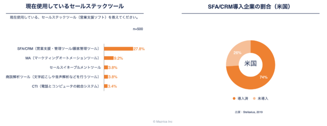 セールス領域特化のツールとしては、SFA/CRMが最も導入率が高いものの、日本のSFA/CRM導入率は、海外(米国)を大きく下回る。