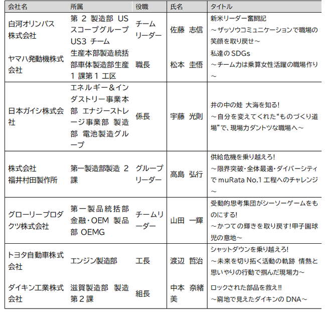今回は、2日間で13社13名のみなさまに日ごろの取り組みを発表いただきました。国内各地の工場現地スタッフやマネージャーなど、ものづくり人材が集結した中での開催となりました。