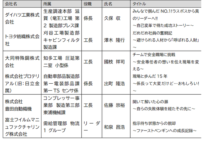 この催しは、第一線監督者による活動事例発表を行い、具体的な改善活動の内容・成果に加え、発表者自身が、第一線監督者としてどのような役割を担い行動し、職場をマネジメントしたかについて発表するものです。参加されたみなさまには現場マネジメントの事例として、また、現場教育の参考事例としてご活用いただいております。
