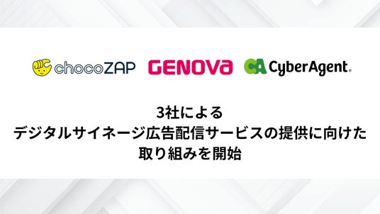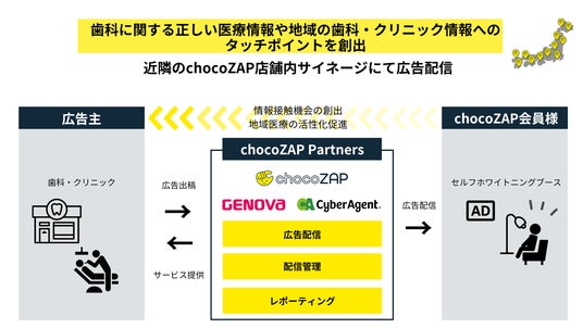 株式会社GENOVA(本社:東京都渋谷区、代表取締役社長:平瀬智樹/以下:GENOVA)は、RIZAP グループ株式会社(本社:東京都新宿区、代表取締役社長 瀬戸健)の連結子会社であるRIZAP株式会社「以下:RIZAP」)のコンビニジム「chocoZAP(チョコザップ)」の新事業「chocoZAP Partners(チョコザップ パートナーズ)」と、株式会社サイバーエージェント(本社:東京都渋谷区、代表取締役:藤田晋/以下:サイバーエージェント)と連携し共同開発した、歯科に特化したデジタルサイネージ広告配信サービスを総代理店として販売することをお知らせいたします。