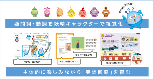 子どもたちが英文を聞く時、名詞ばかり聞き取っているのではないかと感じていました。Where’s~? Do you like~? など文の中には疑問詞や動詞など名詞以外にも大切な要素があることに気づいてもらえるよう、キャラクターとしてビジュアライズしました。こうすることで「りんご」と聞いてそのイメージが湧くのと同じようにWhatと聞けば「何?」と尋ねている妖精キャラクターのWhat-Whatが子どもたちの頭に浮かぶようになります。パイロットクラス※で検証した結果、非常にうまく機能したので採用することにしました。