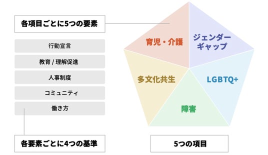 「ダイバーシティスコア」とは、【ジェンダーギャップ】【LGBTQ+】【障害】【多文化共生】【育児・介護】の5つの観点で構成された100項目です。D&Iの重要性・理念の理解や社内啓発だけでなく、具体的な施策も盛り込んでいます。