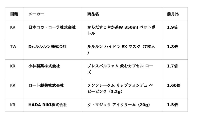 ※本ランキングはPaykeにおける訪日外国人ユーザーの「商品スキャン数」の前月比増加率に基づくものです。売上順位ではありません。