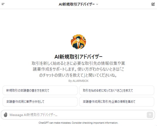 AI与信管理サービスを提供するアラームボックス株式会社(本社:東京都新宿区、代表取締役:武田浩和、以下「当社」)は、OpenAI社が提供するGPT Storeに企業調査会社のノウハウを持つAI与信管理チャットサービス「AI新規取引アドバイザー」の提供を開始します。