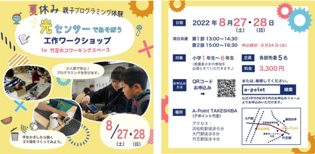 国内最大級の貸会議室サイト「会議室.COM」を運営するアスノシステム株式会社(東京都港区/代表取締役社長 齋藤 武育/以下、「アスノシステム」)は、小学1年生から6年生を対象とした「ナブかつLAB Seeds」の親子プログラミングイベント「光センサーであそぼう 工作ワークショップ」を、2022年8月27日(土)、28日(日)に弊社が運営するコワーキングスペース「A-Point TAKESHIBA」 (https://a-point.work)にて開催いたします。