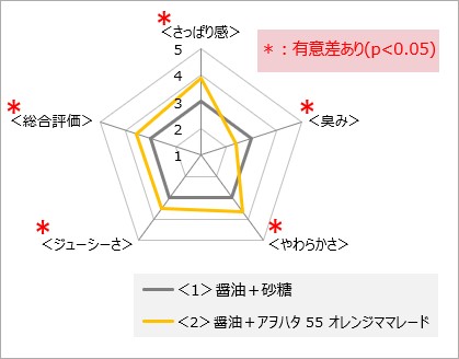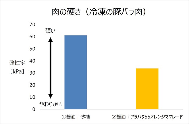 考察:砂糖使用時よりも肉がやわらかく感じた要因として「果実由来の酸で肉の筋繊維がほぐされた」、「ジャムのペクチンや糖が加熱時のタンパク質の硬化を抑制した」。さらに、「かんきつの香りによるマスク効果によりお肉の臭みを感じにくくなった」のではないかと考えられます。今回は豚肉を用いましたが、牛肉や鶏肉でも同様の傾向があると思われます。