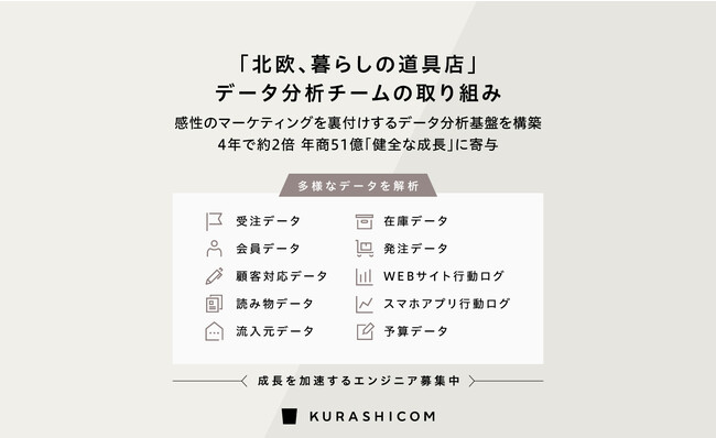 ライフカルチャープラットフォーム「北欧、暮らしの道具店」において、雑貨や衣類などの開発・販売、メディア運営などを行う株式会社クラシコム(本社:東京都国立市、代表取締役:青木耕平、以下「当社」)では、「北欧、暮らしの道具店(URL:https://hokuohkurashi.com/ )」の顧客データやアクセスログなどのビッグデータを活用するため、2019年からデータ分析チームを発足し、解析基盤を構築しました。その結果、チーム発足前後4年間で約2倍となる年商51億円超、D2Cでの商品販売において定価消化率95%達成に寄与した実績を発表いたします。