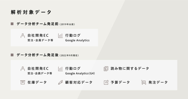 しかし、年間売上が20億円超となり規模が拡大したことを受け、1つの施策にかかるメリットやリスクが大きくなったことや、スマホアプリのリリースにより解析データの幅がさらに広がることで属人的なデータの照らし合わせによる業務負荷の増加を見越し、より効率的なデータ活用を実現するため、2019年よりデータ分析チームを発足しました。
