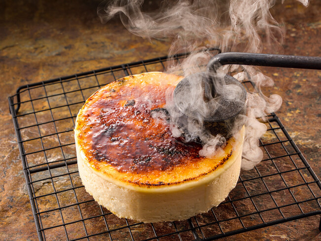 下層はベイクドチーズ、上層はイタリアンメレンゲを使ったシブーストで表面のカソナードを焦がし、