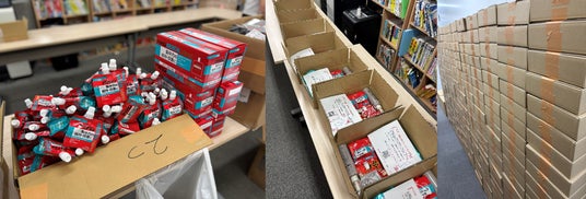 寄贈品のアリナミンメディカルバランス(指定医薬部外品)と完成したパッケージ、配送待ちのパッケージ