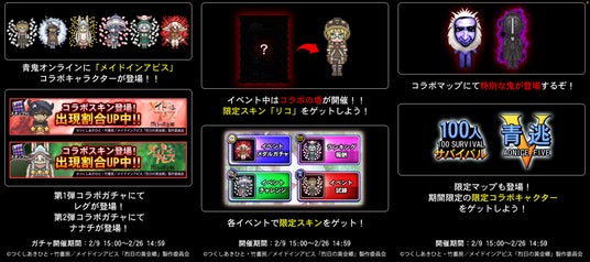 株式会社GOODROID(本社:東京都目黒区、代表取締役社長:松田和彬)は、最大100人のキャラクターが青鬼から逃げ回るマップの中で最後の一人として生き残ることを目指すオンライン・サバイバルゲーム『青鬼オンライン』にて、アニメ『メイドインアビス』コラボイベントが2月9日(金)15:00より開始したことをお知らせいたします。