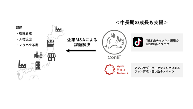 この度、その課題解決のためのM&Aアドバイザリー事業を子会社のコンフィにて開始するにあたり、会社の売買だけでなく、コンフィの持つTikTokチャンネルの運用におけるノウハウと、AMNのアンバサダーマーケティングのノウハウを活かすことで、商品・サービスの認知獲得・拡散から、新たなファンの育成と既存顧客の活性化を行い、企業の目先の課題解決だけでなく、中長期の成長も支援していくことで、地方創生に寄与・貢献することを目指したいと考えております。