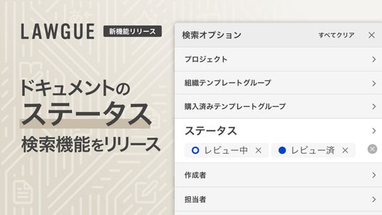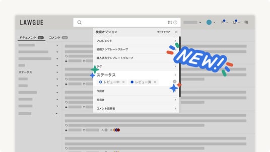 AIを搭載したクラウド ドキュメント ワークスペース「LAWGUE」を提供するFRAIM株式会社(本社:東京都渋谷区、代表取締役社長:宮坂豪)は、「LAWGUE」内でのドキュメントの検索において、「レビュー中」「レビュー済」といった任意のステータスでの検索結果をフィルタリングできる新機能を実装いたしました。