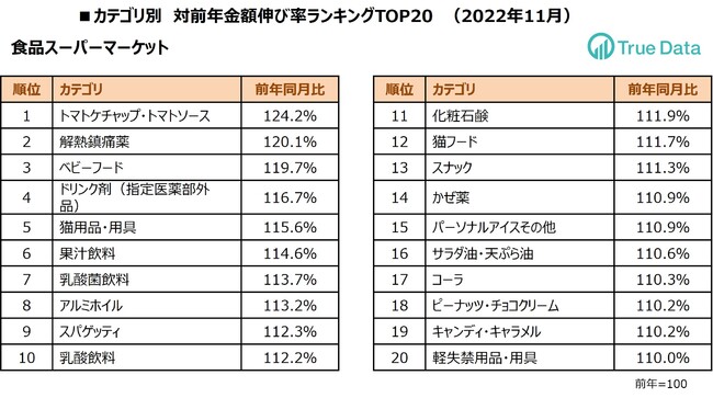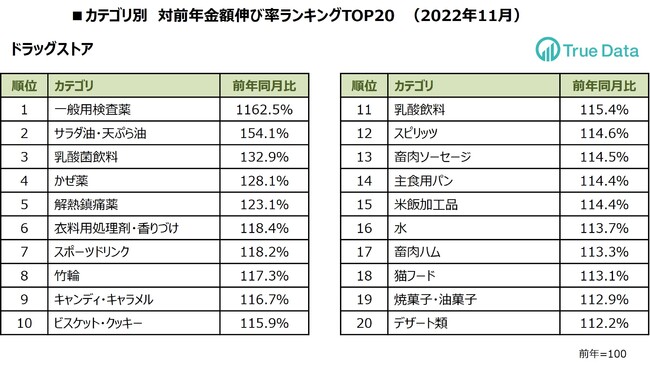 ~ドラッグストア、食品スーパーマーケット 2022年11月の対前年伸び率TOP20カテゴリを発表 ~