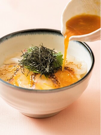 淡路島産の真蛸を柔らか煮と天婦羅に仕上げ、鯛は自家製の甘だれと生卵で掛け御飯にして、お召し上がりください。