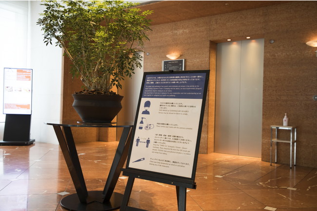 ・ホテル館内各所とすべての化粧室に高濃度のアルコール消毒液を設置しています。