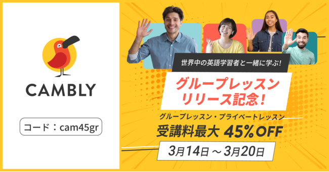 ネイティブ講師とのオンライン英会話サービス「CAMBLY(キャンブリー)」を提供するCambly Inc.(本社:アメリカ・サンフランシスコ、日本代表:佐藤 亜希子)は、世界中の英語学習者と一緒に英会話レッスンを受けられる「グループレッスン」をリリースしました。リリースを記念して 3月14日(火)から20日(月)までの7日間、プライベートレッスン・グループレッスンどちらの英会話レッスンも受講料最大45%オフでご利用いただけるセールを開催いたします。