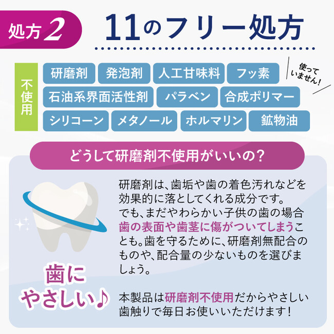 11のフリー!研磨剤、発泡剤、人工甘味料、フッ素、石油系界面活性剤、パラベン、鉱物油フリー