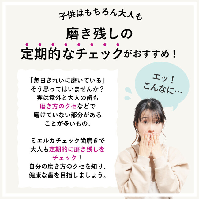 ミエルカチェックハミガキで大人も定期的な磨き残しのチェックがおすすめです。