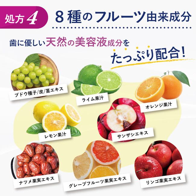 《日本製》機能面だけではなく高級成分のキシリトール・8種類のフルーツ由来美容液成分を潤沢配合!