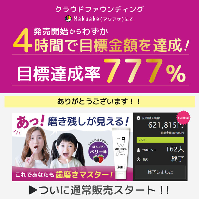 Makuakeのプロジェクトにて、発売開始からわずか4時間で目標金額を達成!目標金額の777%を達成いたしました。想像を上回る数多くの方々にご支援や応援のメッセージをいただきました。