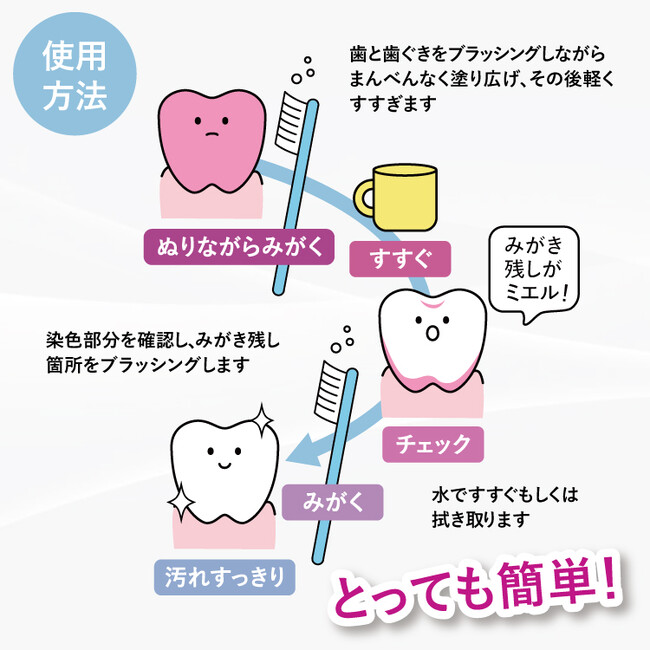 3ステップで簡単なので、いつでも気軽に磨き残しチェックが可能です。