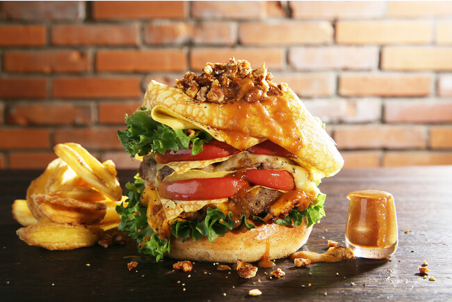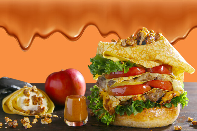 フランスなどではポピュラーで人気の食事系クレープからインスパイア!クレープ生地、石窯焼きの旬の紅玉りんご、ダブルチーズパティ、レタス、キャラメルウォールナッツなどを幾層にも重ね、ミルクレープを表現したハンバーガー。ボリューム感たっぷりの”ハンバーガー”でありながら、モチモチの“クレープ”、サクサク食感がアクセントのキャラメルウォールナッツなどでスイーツのような甘じょっぱさが絶妙なバランスでプラスされた、新感覚の味わいをお楽しみいただけます。