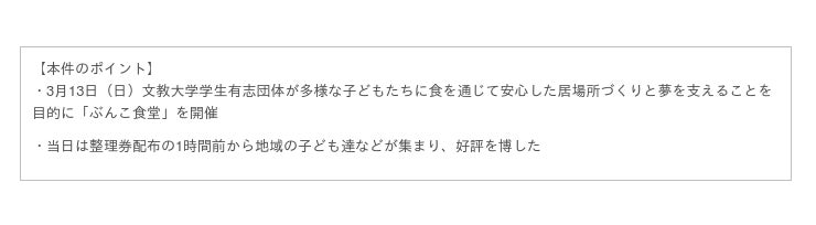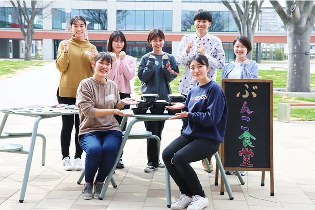 「ぶんこ食堂」は、文教大学の学生有志団体が開催する子ども食堂です。国際学部3年生の内田イオナさんを中心に、10名のメンバーで活動しています。コロナ禍により、ひとり親世帯の収入が減少している家庭があることや、大学周辺地域には子ども食堂がないことを知ったことをきっかけに、子どもの居場所を作り、子どもたちに食を通じた安全と夢を提供したいという想いで、2021年11月から活動を始めました。文教大学公式マスコットキャラクター「BUNKO(ぶんこ)」から団体名がつけられています。