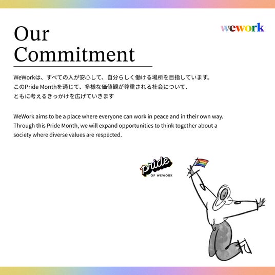WeWork Japan は、「誰もが自分らしく働ける環境を創る」という理念のもと、性的指向・性自認を問わず、社員および入居メンバーが安心して働ける環境づくりを推進しています。また、「人権ポリシー」に基づき、多様性と包括性のあるオフィス環境とコミュニティを提供しています。今後も、業界、性別、性的指向に関係なく、多様な価値観を尊重し、すべての人が自分らしく働ける働きやすい環境づくりを進めてまいります。