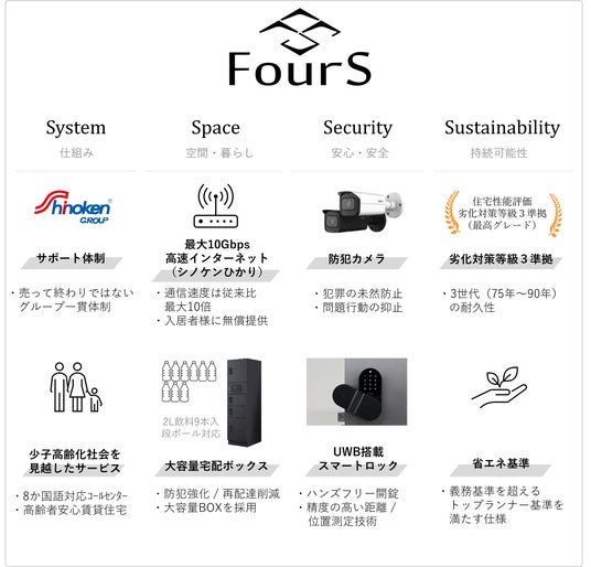 結果として空室リスクの低減、オーナー様の長期にわたる安定稼働と確かな資産づくりに貢献します。この「FourS」は、入居者様のニーズとオーナー様の安心を追及する4つの視点から構成され、当社グループの住まいづくりへの哲学が凝縮されています。