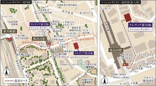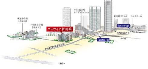 「クレヴィア新川崎」は、JR横須賀線・湘南新宿ライン「新川崎」駅から徒歩9分、JR南武線「鹿島田」駅から徒歩4分の2駅3路線が利用可能な便利な立地に誕生します。最寄りの「鹿島田」駅から、屋根付きペデストリアンデッキで結ばれている「新川崎」駅は、東京、品川、新宿、横浜などのビッグターミナルに直結し、通勤・通学にも便利なロケーションです。約100店舗が連なる「かしまだ駅前通商店街」まで徒歩1分の立地でありながら、住宅街の通りに一歩入った場所に位置しているため、落ち着いた住環境を享受できます。