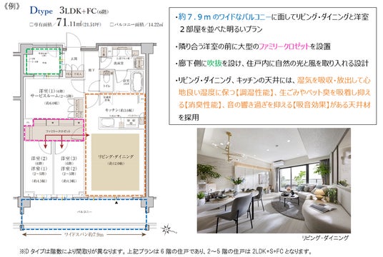間取りは、2LDK~4LDKの全18タイプ(事業協力者住戸含む)。全74戸中45戸の住戸を間口7m以上のワイドスパン設計とし、通風採光の良さに加え、空間効率の良いゆとりのプランを実現しました。住まう方のライフスタイルのこだわりにお応えすべく、「ファミリークロゼット付きプラン」や、間取りを自由に変えられる「間取りのない家プラン」、自然の光と風を室内に取り入れられるよう内廊下側に「吹抜を配置したプラン」など、個性あふれるプランニングを実現しました。また、マンションの気密性の高い部屋では、反響音が気になったり、臭いや湿気がこもりやすい傾向があるため、リビング・ダイニングおよびキッチンの天井には、調湿・消臭・吸音の効果がある天井材を採用し、快適性を高めました。