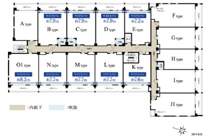 各住戸へのアプローチは内廊下設計を採用。室内に自然の光と風を取り入れやすくするため、内廊下側の一部に吹抜を設け、快適性とプライバシー性の高さを両立させました。