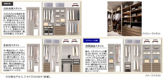 一部のプランでは、大容量のファミリークロゼットを備えました。2つの洋室をつなぐように設置したファミリークロゼットは、家族全員の衣類や荷物、共用のものなどを集約して収納できます。洋室の外にクロゼットを設置することで、各洋室をゆったり使うことができるほか、家族の衣類が1ヶ所に揃うため生活動線や家事効率の向上にもつながります。ライフステージ毎に家族の持ち物が変わり、お子様の成長によって持ち物は変化します。そんな日々の変化に合わせて、アイテムの入れ替えや一人ひとりの収納スペースの区分け変更にも対応しやすいクロゼットです。収納形状は3種類からお選びいただけます。