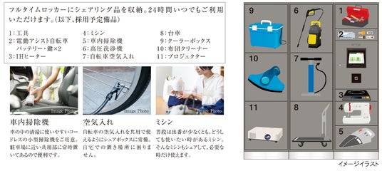 本物件では、車内掃除機、台車、プロジェクター、ミシンなど、使用頻度はそこまで高くないけどあると便利なもの・自宅に置いておくとかさばるものを共用備品としてシェアできる「シェアリングサービス」を導入しました。シェアボックスを利用するため、24時間、いつでも必要な時にご利用いただくことが可能です。収納効率向上や家計節約などにも貢献します。