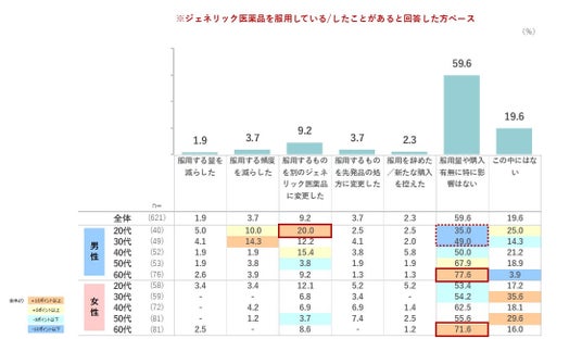 「服用量や購入有無に特に影響はない」との回答は、男女とも60代が最も多く、男性60代77.6%(全体より+18.0pts)、女性60代71.6%(+12.0pts)でした。「影響はない」との回答は男女とも20・30代で全体値より5pts以上低いなか、「服用するものを別のジェネリック医薬品に変更した」では、20代男性が20.0%と全体より10.8pts多くなっています。
